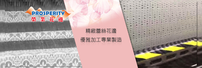 Prosperity Lace Company is mainly engaged in warp knitted lace mesh fabric, weft knitted fabric , jacquard lace, elastic lace, all kinds of belts, lace embroidery production and sales, annual production of nearly 15 million yards.
